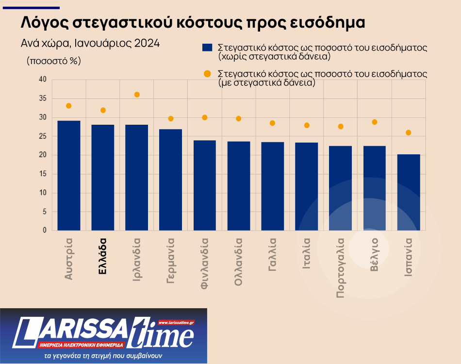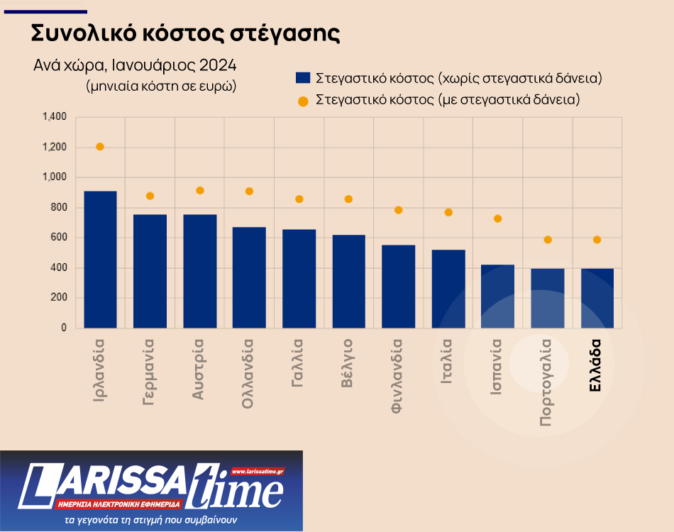 Ειδικότερα για την Ελλάδα, όπως προκύπτει από τους πίνακες που συνοδεύουν την ανάλυση, η χώρας μας βρίσκεται στην τελευταία θέση σε ό,τι αφορά το κόστος στέγασης, για τον Ιανουάριο του 2024