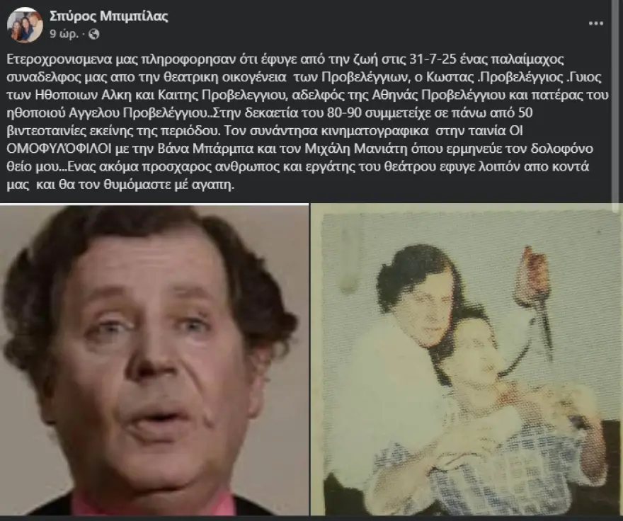 Στη δημοσίευση που έκανε στον προσωπικό του λογαριασμό στο Facebook, ο Σπύρος Μπιμπίλας έγραψε: «Ετεροχρονισμένα μας πληροφόρησαν ότι έφυγε από τη ζωή στις 31-7-25 ένας παλαίμαχος συνάδελφος μας από τη θεατρική οικογένεια των Προβελέγγιων, ο Κώστας. Προβελέγγιος. Γιος των Ηθοποιών Αλκή και Καίτης Προβελλέγγιου, αδελφός της Αθηνάς Προβελέγγιου και πατέρας του ηθοποιού Άγγελου Προβελέγγιου.. Στην δεκαετία του 80-90 συμμετείχε σε πάνω από 50 βιντεοταινίες εκείνης της περιόδου. Τον συνάντησα κινηματογραφικά στην ταινία «Οι Ομοφυλόφιλοι» με τη Βάνα Μπάρμπα και τον Μιχάλη Μανιάτη όπου ερμήνευε τον δολοφόνο θείο μου… Ένας ακόμα πρόσχαρος άνθρωπος και εργάτης του θεάτρου έφυγε λοιπόν από κοντά μας και θα τον θυμόμαστε με αγάπη».
