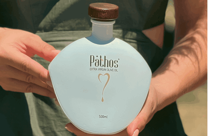 Το ελαιόλαδο Pathos, βραβευμένο και βιολογικό, διατίθεται σε ένα προσεγμένο γυάλινο μπουκάλι των 500ml, μέσα σε πολυτελή χάρτινη συσκευασία που αποπνέει κομψότητα και αυθεντικότητα. Η σχεδίαση του μπουκαλιού αποτυπώνει τη βαθιά σύνδεση με το ιερό δέντρο της ελληνικής γης.