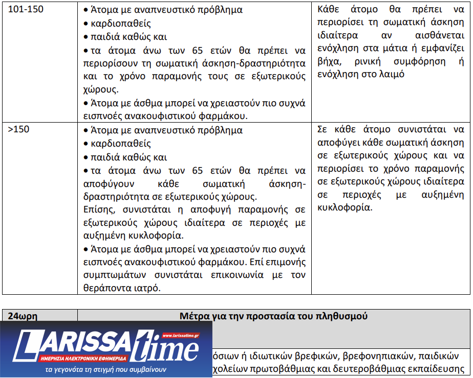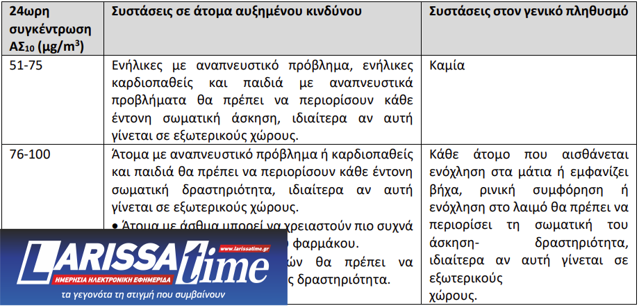 Ανάλογα με την εκτίμηση των μέσων ημερήσιων (24ωρων) επιπέδων συγκέντρωσης των αιωρούμενων σωματιδίων, όπως ανακοινώνεται από τις αρμόδιες Υπηρεσίες (Υπουργείο Περιβάλλοντος, Υπηρεσίες Περιβάλλοντος των Π.Ε. ) και για συγκεντρώσεις μεγαλύτερες από 50μg/m3 οι συστάσεις και τα μέτρα προστασίας του πληθυσμού έχουν ως εξής: