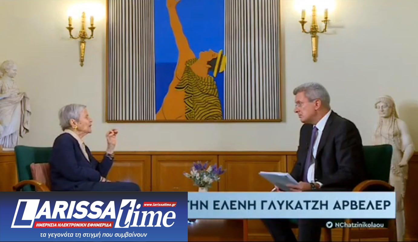 Για τα παιδικά της χρόνια, την ένταξή της στην Αντίσταση καθώς και τα δύσκολα χρόνια της κατοχής είχε μιλήσει, μεταξύ άλλων, στις 26 Οκτωβρίου του 2020, στην εκπομπή «Ενώπιος Ενωπίω» και τον Νίκο Χατζηνικολάου, η Ελένη Γλύκατζη-Αρβελέρ, η οποία έφυγε από τη ζωή σήμερα σε ηλικία 99 ετών.