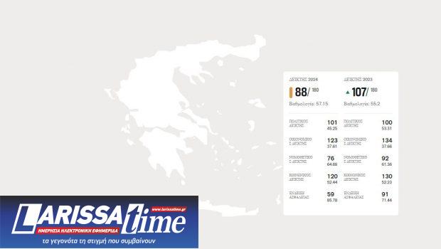 Η συνολική βαθμολογία που συγκεντρώνει για το 2023 η χώρα μας κυμαίνεται στο ίδιο επίπεδο με την προηγούμενη χρονιά, με μια μικρή άνοδο 1,95: 57,2 συνολική βαθμολογία για το 2023 έναντι 55,2 για το 2022.