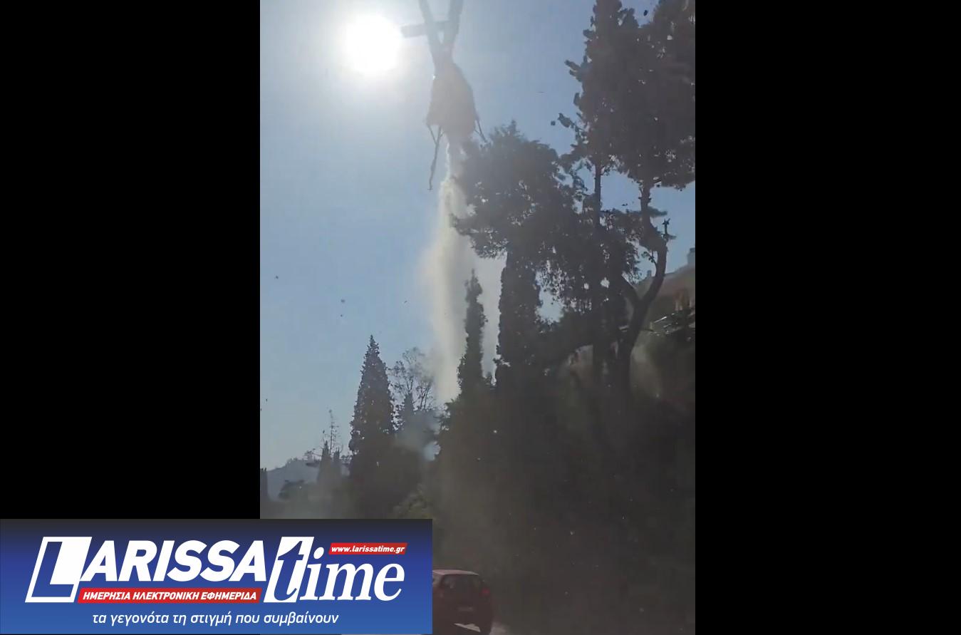 Από την ορμή του νερού ένα δέντρο σχεδόν κόβεται στη μέση.