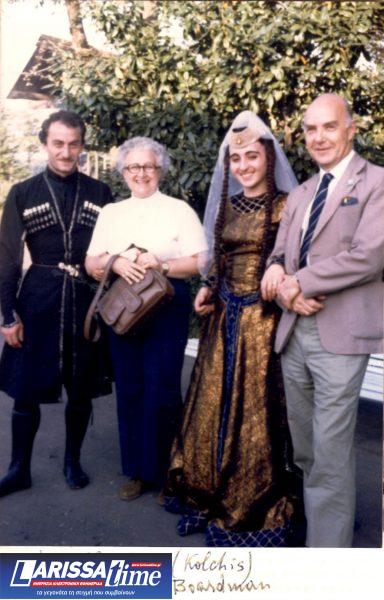 Η Μπρούνι Ρίντγκουέι και ο Τζον Μπορντμαν με χορευτές από τη Γεωργία στο συμπόσιο «Κολχίς, 5ο Διεθνές Συμπόσιο για την Αρχαία Ιστορία της παραλιακής ζώνης της Μαύρης Θάλασσας, 1987».