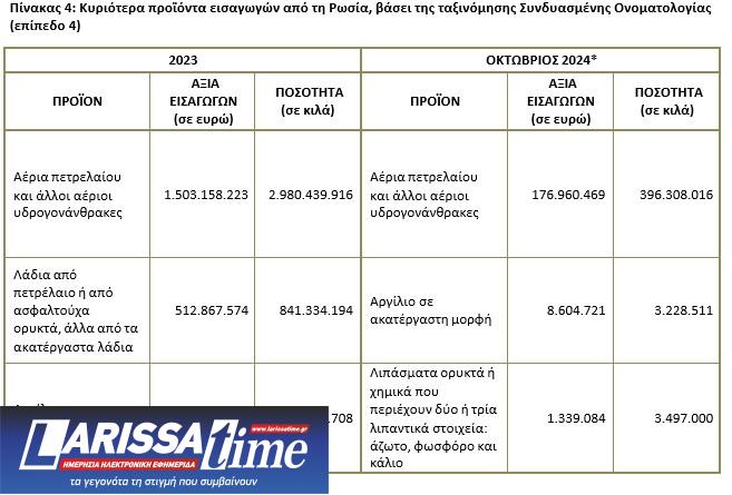 Η αξία των εισαγωγών της Ελλάδας από τη Ρωσία ανήλθε σε 189,2 εκατ. ευρώ, σημειώνοντας αύξηση 8,8% σε σχέση με τον Οκτώβριο του 2023 που ήταν 173,9 εκατ. ευρώ.