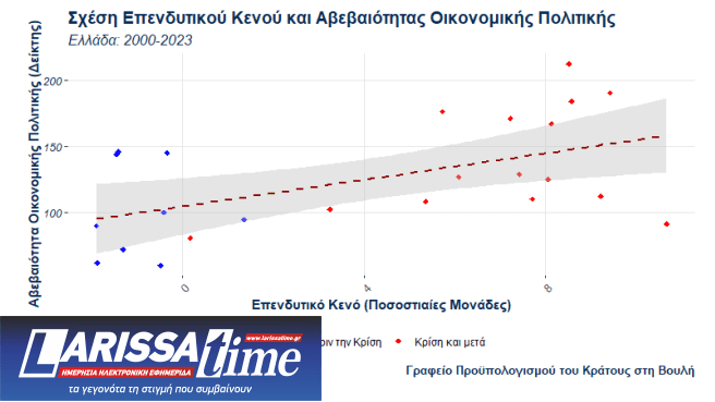 Η θετική σχέση μεταξύ αβεβαιότητας και επενδυτικού κενού για την Ελλάδα, που είναι συμβατή με τη διεθνή βιβλιογραφία, έχει ένα σημαντικό και ξεκάθαρο μήνυμα πολιτικής: η (οικονομική και πολιτική) σταθερότητα στην Ελλάδα συνδέεται με τον περιορισμό του επενδυτικού κενού, με το Γραφείο να θεωρεί ότι λειτουργεί ως αναγκαία συνθήκη για την επίτευξη του στόχου της μείωσής του.