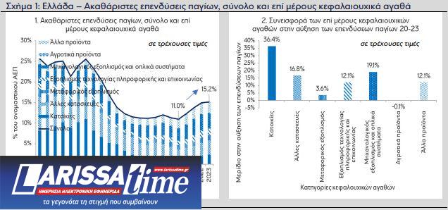Συνεπώς, τα κεφαλαιουχικά αγαθά πλην κατοικιών συνεισέφεραν το 63,6% της ενίσχυσης των επενδύσεων παγίων από το 11,0% του ΑΕΠ το 2019 στο 15,2% το 2023.