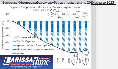 Εξαιρουμένων των θεσμικών τομέων των νοικοκυριών (κυρίως επενδύσεις σε κατοικίες) και των χρηματοοικονομικών επιχειρήσεων, η συρρίκνωση του αποθέματος του κεφαλαίου της οικονομίας ήταν αρκετά μικρότερη στα €26,2 δισεκ. το 2023 (€37,3 δισεκ. το 2021).