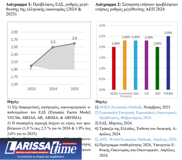 Ειδικότερα, σύμφωνα με το Ελληνικό Δημοσιονομικό Συμβούλιο, το μακροοικονομικό του σενάριο είναι συνεπές με εκείνο του Προγράμματος Σταθερότητας 2023 και με το αντίστοιχο του Κρατικού Προϋπολογισμού για το έτος 2024. Οι προβλέψεις του ΕΔΣ για τον ρυθμό αύξησης του ΑΕΠ (2,3% για το 2024 και 2,4% για το 2025) συγκλίνουν αν και λίγο πιο συντηρητικές, με το μακροοικονομικό σενάριο που περιγράφεται στο τρέχον ΠΣ 2024, καθώς και με αυτές της Ευρωπαϊκής Επιτροπής και άλλων εγχώριων και διεθνών φορέων.