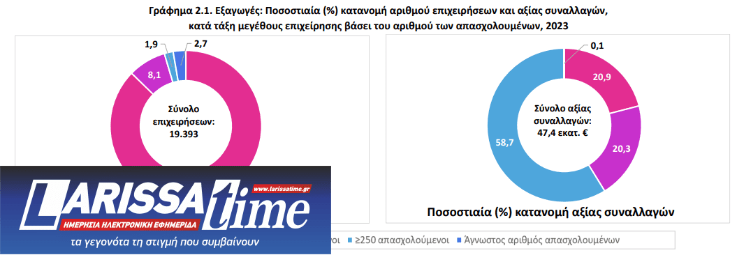 Ειδικότερα, σύμφωνα με τα στοιχεία της ΕΛΣΤΑΤ, συνολικά 19.393 επιχειρήσεις πραγματοποίησαν το 2023 εξαγωγές συνολικής αξίας 47.358,7 εκατ. ευρώ, εκ των οποίων το 71,3% (33.792,2 εκατ. ευρώ) πραγματοποιήθηκε από επιχειρήσεις των τομέων οικονομικής δραστηριότητας «Μεταποίησης», «Παροχής ηλεκτρικού ρεύματος, φυσικού αερίου, ατμού και κλιματισμού», «Παροχής νερού, επεξεργασίας λυμάτων, διαχείρισης αποβλήτων και δραστηριοτήτων εξυγίανσης» και «Ορυχείων και λατομείων», (5.901 επιχειρήσεις, 30,4% του συνολικού αριθμού των επιχειρήσεων).