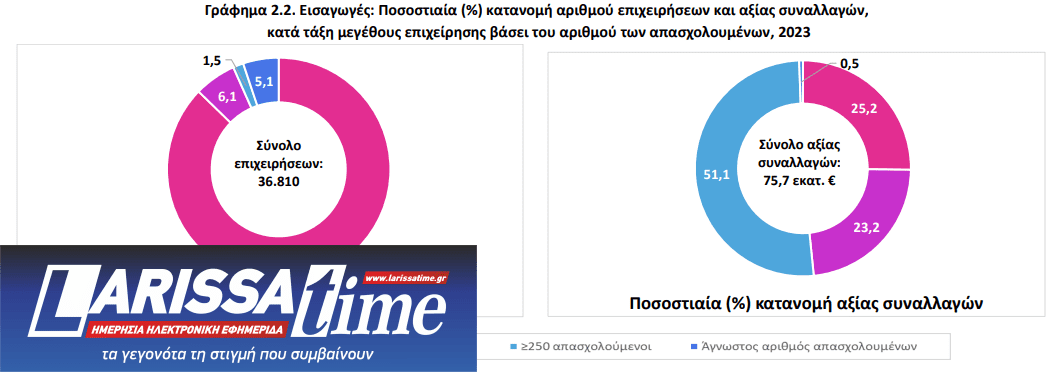 Όσον αφορά στις εισαγωγές, συνολικά 36.810 επιχειρήσεις πραγματοποίησαν το 2023 εισαγωγές συνολικής αξίας 75.712,5 εκατ. ευρώ, εκ των οποίων το 50,7% (38.368,6 εκατ. ευρώ) πραγματοποιήθηκε από επιχειρήσεις των τομέων οικονομικής δραστηριότητας «Μεταποίησης», «Παροχής ηλεκτρικού ρεύματος, φυσικού αερίου, ατμού και κλιματισμού», «Παροχής νερού, επεξεργασίας λυμάτων, διαχείρισης αποβλήτων και δραστηριοτήτων εξυγίανσης» και «Ορυχείων και λατομείων» (7.207 επιχειρήσεις, 19,6% του συνολικού αριθμού των επιχειρήσεων).