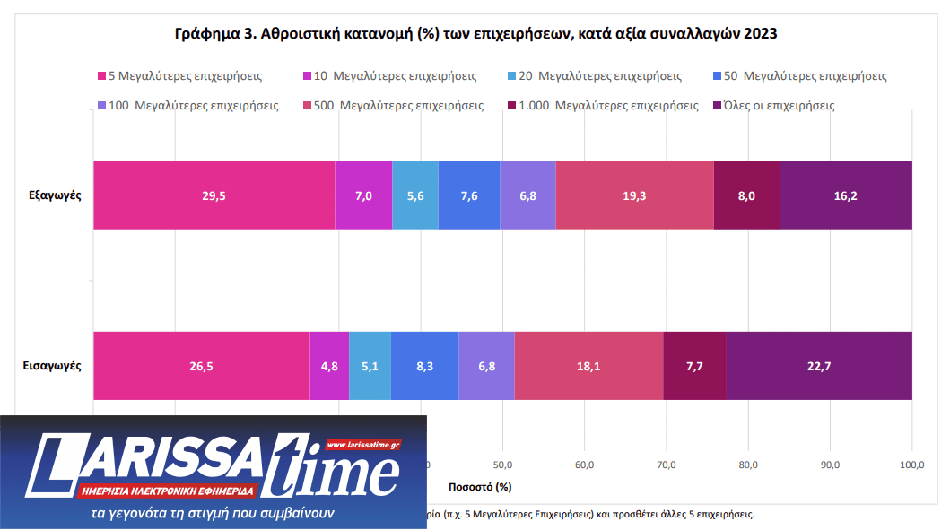 Από την ανάλυση της κατανομής των επιχειρήσεων με βάση το μέγεθος της αξίας των συναλλαγών που διενήργησαν, όσον αφορά στις εξαγωγές, το 29,5% της συνολικής αξίας των εξαγωγών πραγματοποιήθηκε από 5 συνολικά επιχειρήσεις, το 49,7% της συνολικής αξίας των εξαγωγών πραγματοποιήθηκε από 50 συνολικά επιχειρήσεις, το δε 83,8% πραγματοποιήθηκε από 1.000 συνολικά επιχειρήσεις.