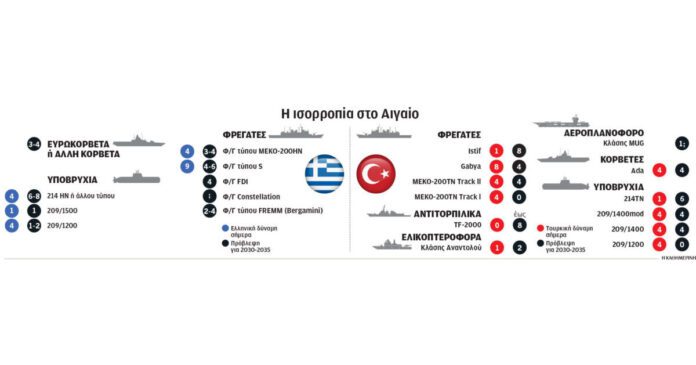 Η Τουρκία έχει να αντιπαρατάξει αρκετών τύπων μονάδες επιφανείας παλαιού τύπου (όπως οι γερμανικές ΜΕΚΟ ή οι αμερικανικές OHP (Gabya), ωστόσο το τουρκικό ναυτικό διαθέτει πλέον αρκετούς τύπους εγχώριας ναυπήγησης πλοίων, όπως οι κορβέτες Ada ή το ευρισκόμενο σε εξέλιξη πρόγραμμα των φρεγατών Istif. Η Τουρκία κλείνει την ψαλίδα στον τομέα των υποβρυχίων καθώς σταδιακά παραδίδονται τα δικά της υποβρύχια αναερόβιας πρόωσης τύπου 214, τομέας όπου μέχρι πρότινος η Ελλάδα είχε σαφές προβάδισμα.