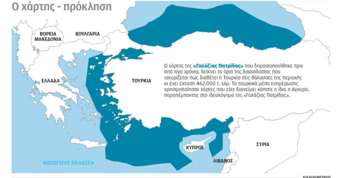 ΚΩΝΣΤΑΝΤΙΝΟΥΠΟΛΗ – ΑΝΤΑΠΟΚΡΙΣΗ. Με απόφαση του υπουργείου Παιδείας της Τουρκίας, στα σχολικά βιβλία της γειτονικής χώρας εντάσσεται για πρώτη φορά από την επόμενη χρονιά η θεωρία της «Γαλάζιας Πατρίδας». Αυτό αποκάλυψαν οι εφημερίδες Turkiye και Takvim, οι οποίες ανέφεραν πως στη νέα διδακτέα ύλη, που αποκαλείται «το διδακτικό σύστημα του αιώνα της Τουρκίας», οι χάρτες και το δόγμα της «Γαλάζιας Πατρίδας» θα διδάσκονται στο μάθημα της Γεωγραφίας στη δευτεροβάθμια εκπαίδευση σύμφωνα με τις συστάσεις του υπουργείου.