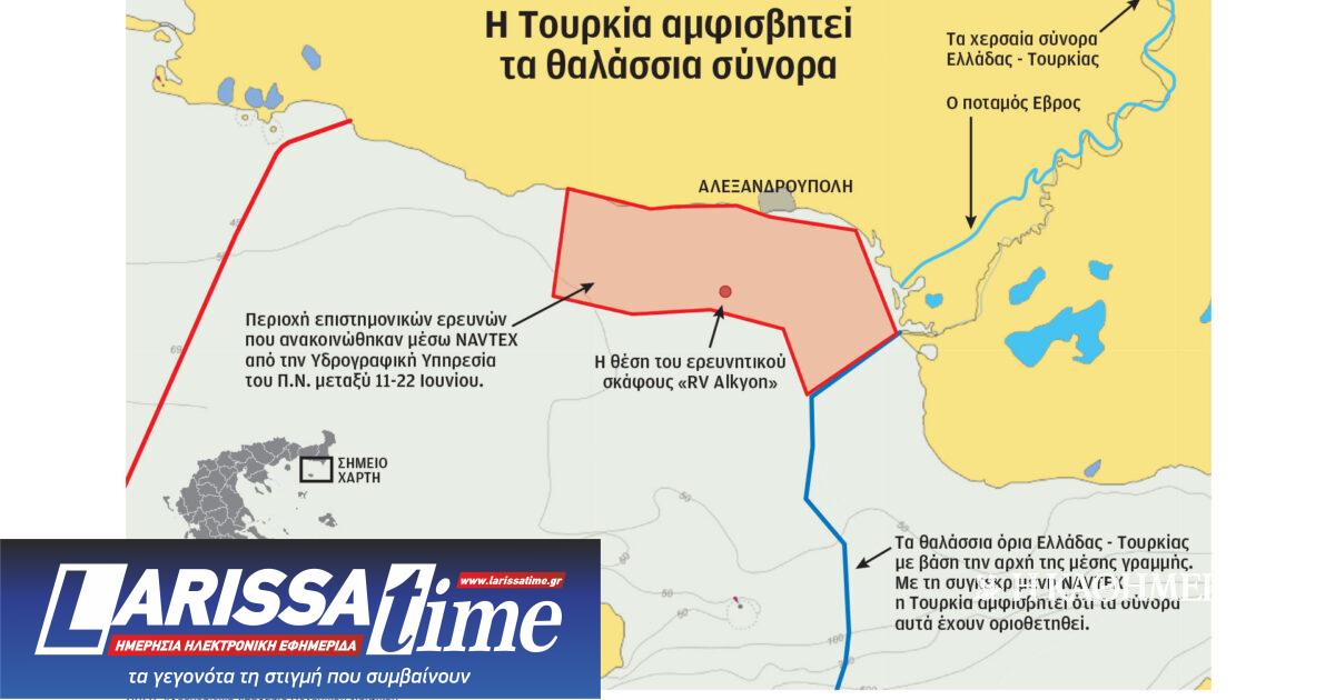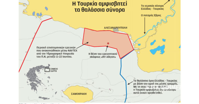Με σαφή και ξεκάθαρο τρόπο η Αγκυρα αμφισβητεί και τα γενικώς παραδεδεγμένα περί χρήσης της μέσης γραμμής, ακόμη και στις εκβολές ποταμών, για την οριοθέτηση θαλασσίων συνόρων. Με NAVTEX του σταθμού της Σμύρνης (0536/24), η Αγκυρα καταγγέλλει τις επιστημονικές έρευνες που έχουν ανακοινωθεί από την Αθήνα με το επιστημονικό σκάφος «R/V Alkyon» (NAVTEX 091/24 του σταθμού Υδρογραφικής Υπηρεσίας Λήμνου), στις εκβολές του Εβρου, εντός ελληνικών χωρικών υδάτων μέχρι και τις 22 Ιουνίου. Η περιοχή που έχει δεσμευθεί, αναφέρεται στην τουρκική NAVTEX, «είναι πλησίον και εντός των πλευρικού θαλασσίου ορίου Ελλάδας – Τουρκίας, το οποίο δεν έχει ακόμη οριοθετηθεί».