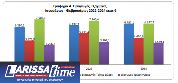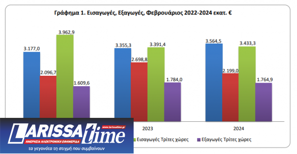 Το έλλειμμα του εμπορικού ισοζυγίου κατά τον μήνα Φεβρουάριο 2024 ανήλθε σε 3.033,9 εκατ. ευρώ (3.239,2 εκατ. δολάρια) έναντι 2.263,9 εκατ. ευρώ (2.389,6 εκατ. δολάρια) κατά τον ίδιο μήνα του έτους 2023, παρουσιάζοντας αύξηση, σε ευρώ, 34,0%. Η αντίστοιχη αξία χωρίς τα πετρελαιοειδή κατά τον μήνα Φεβρουάριο 2024 παρουσίασε αύξηση του ελλείμματος κατά 443,5 εκατ. ευρώ, δηλαδή 24,1%, ενώ η αντίστοιχη αξία χωρίς τα πετρελαιοειδή και τα πλοία κατά τον μήνα Φεβρουάριο 2024 παρουσίασε αύξηση κατά 418,9 εκατ. ευρώ, δηλαδή 22,7% σε σχέση με τον μήνα Φεβρουάριο 2023.
