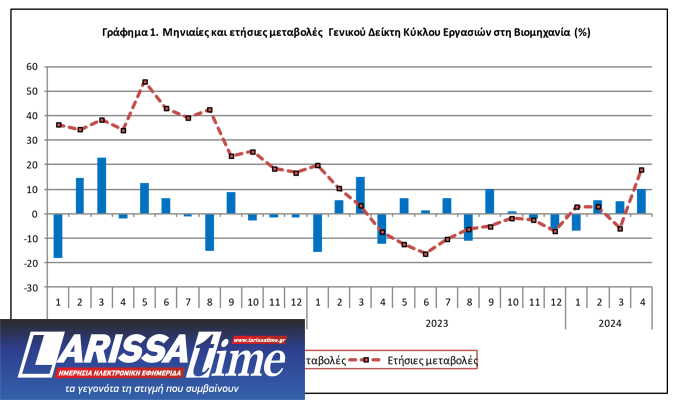 Σύμφωνα με την ΕΛΣΤΑΤ, ο Γενικός Δείκτης Κύκλου Εργασιών στη Βιομηχανία (σύνολο εγχώριας και εξωτερικής αγοράς) του μηνός Απριλίου 2024, σε σύγκριση με τον αντίστοιχο δείκτη του Απριλίου 2023, παρουσίασε αύξηση 18,0% έναντι μείωσης 7,4% που σημειώθηκε κατά την αντίστοιχη σύγκριση του έτους 2023 με το 2022.