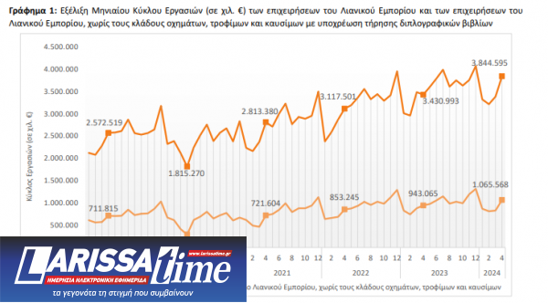 Σύμφωνα με την ΕΛΣΤΑΤ, για τις επιχειρήσεις του τομέα λιανικού εμπορίου με υποχρέωση τήρησης διπλογραφικών βιβλίων, για τις οποίες υπάρχουν διαθέσιμα στοιχεία σε μηνιαία βάση, ο κύκλος εργασιών τον Απρίλιο 2024 ανήλθε σε 3,84 δισ. ευρώ, σημειώνοντας αύξηση 12,1% σε σχέση με τον Απρίλιο 2023 που είχε διαμορφωθεί σε 3,43 δισ. ευρώ και αύξηση 13,6% σε σχέση με το Μάρτιο του 2024 που είχε διαμορφωθεί σε 3,39 δισ. ευρώ.