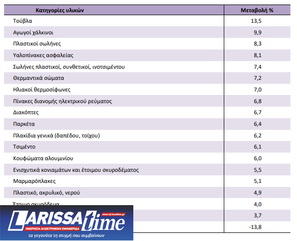 Ειδικότερα, σύμφωνα με την ΕΛΣΤΑΤ, ο Γενικός Δείκτης Τιμών Υλικών Κατασκευής Νέων Κτηρίων Κατοικιών, με έτος βάσης 2021=100,0 και μήνα αναφοράς τον Μάιο 2024, σε σύγκριση με τον αντίστοιχο δείκτη του Μαΐου 2023 παρουσίασε αύξηση 5,5%, έναντι αύξησης 7,8% που σημειώθηκε κατά τη σύγκριση των αντίστοιχων δεικτών του έτους 2023 με το 2022.