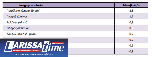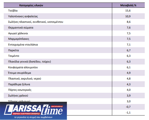 Ειδικότερα, σύμφωνα με την ΕΛΣΤΑΤ, οι τιμές κινήθηκαν ανοδικά σε υλικά κατασκευής: Τούβλα (15,6%), Υαλοπίνακες ασφαλείας (10,9%), Σωλήνες πλαστικούς, συνθετικούς, ινοτσιμέντου (8,6%), Θερμαντικά σώματα (7,6%), Αγωγούς χάλκινους (7,5%), Μαρμαρόπλακες (7,5%), Εντοιχισμένα ντουλάπια (7,1%), Παρκέτα (6,7%), Τσιμέντο (6,3%), Πλακίδια γενικά- δαπέδου, τοίχου (6,3%), Κουφώματα αλουμινίου (6,1%), Έτοιμο σκυρόδεμα (4,9%), Πλαστικό, ακρυλικό, νερού (4,8%), Παράθυρα ξύλινα (4,3%), Πόρτες εσωτερικές (4%), Σωλήνες χαλκού (3,9%) και Σίδηρο οπλισμού (3%). Αντίθετα, οι τιμές μειώθηκαν σε: Ηλεκτρική ενέργεια (1,1%) και Πετρέλαιο κίνησης- Diesel (0,7%).