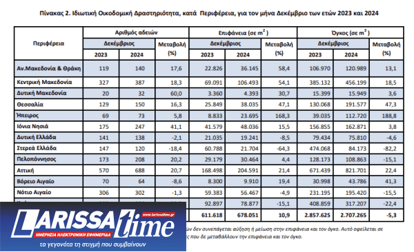 Οι εκδοθείσες άδειες Ιδιωτικής Οικοδομικής Δραστηριότητας, στο σύνολο της χώρας, κατά τον μήνα Δεκέμβριο 2024 ανήλθαν σε 2.885 οικοδομικές άδειες, που αντιστοιχούν σε 678.051 m2 επιφάνειας και 2.707.265 m3 όγκου, παρουσιάζοντας αύξηση κατά 15,5% στον αριθμό των οικοδομικών αδειών, αύξηση κατά 10,9% στην επιφάνεια και μείωση κατά 5,3% στον όγκο, σε σχέση με τον αντίστοιχο μήνα του 2023.