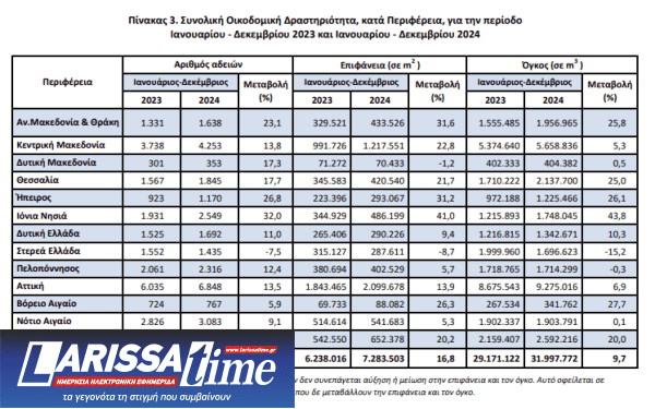 Κατά την περίοδο των τελευταίων δώδεκα μηνών, δηλαδή από τον Ιανουάριο 2024 έως τον Δεκέμβριο 2024, το μέγεθος της Συνολικής Οικοδομικής Δραστηριότητας (Ιδιωτικής-Δημόσιας) με βάση τις εκδοθείσες οικοδομικές άδειες, στο σύνολο της χώρας, ανήλθε σε 30.992 οικοδομικές άδειες, που αντιστοιχούν σε 7.283.503 m2 επιφάνειας και 31.997.772 m3 όγκου. Σε σχέση με την αντίστοιχη περίοδο Ιανουαρίου – Δεκεμβρίου 2023 παρατηρήθηκε αύξηση κατά 14,9% στον αριθμό των οικοδομικών αδειών, αύξηση κατά 16,8% στην επιφάνεια και αύξηση κατά 9,7% στον όγκο.
