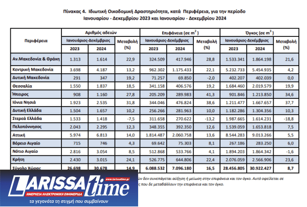 Κατά την ίδια χρονική περίοδο, Ιανουαρίου – Δεκεμβρίου 2024, η Ιδιωτική Οικοδομική Δραστηριότητα, εμφανίζει στο σύνολο της Χώρας, αύξηση κατά 14,9% στον αριθμό των εκδοθεισών οικοδομικών αδειών, αύξηση κατά 16,5% στην επιφάνεια και αύξηση κατά 8,7% στον όγκο, σε σύγκριση με την αντίστοιχη περίοδο Ιανουαρίου – Δεκεμβρίου 2023. Το ποσοστό συμμετοχής της Δημόσιας Οικοδομικής Δραστηριότητας στον συνολικό οικοδομικό όγκο, για την ανωτέρω περίοδο, είναι 3,4% .