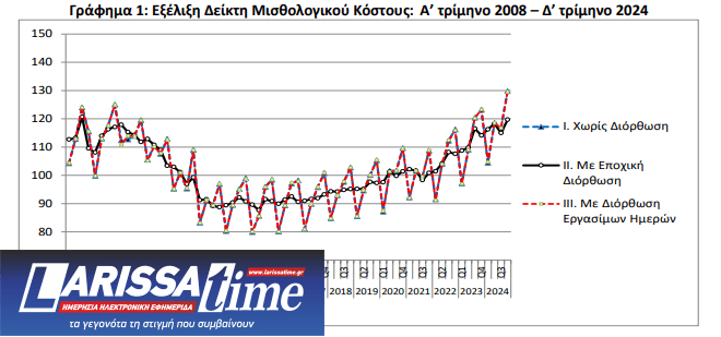 Στο Γράφημα 1 παρουσιάζεται η εξέλιξη του Δείκτη Μισθολογικού Κόστους για τη χρονική περίοδο: Α΄ τρίμηνο 2008 – Δ΄ τρίμηνο 2024 (με ή χωρίς εποχική διόρθωση και με διόρθωση εργασίμων ημερών).