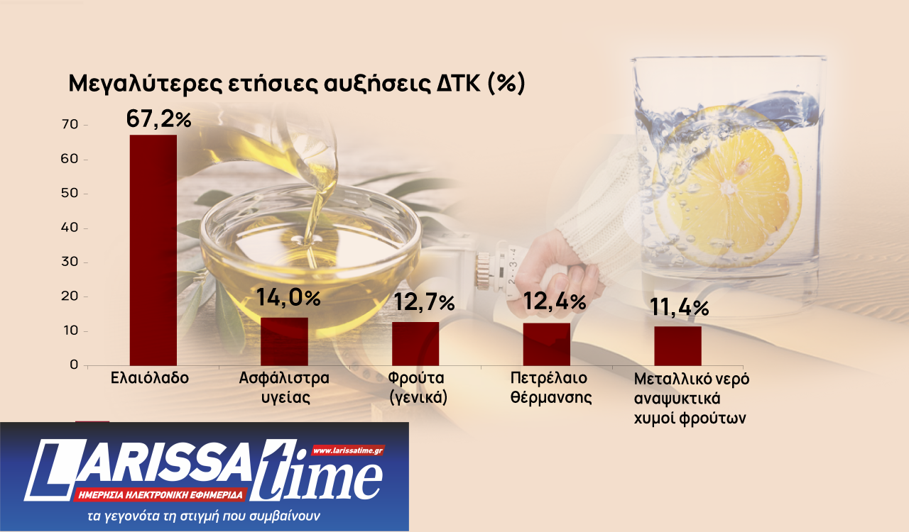Την ίδια στιγμή, σε ετήσια βάση, το ελαιόλαδο κάνει ράλι με αυξήσεις 67,2%, ενώ στα φρούτα οι τιμές είναι 12,7% υψηλότερες. Αναψυκτικά και χυμοί κοστίζουν 11,4% ακριβότερα, ενώ ανατιμήσεις της τάξης του 5,7% καταγράφονται στα ψάρια.