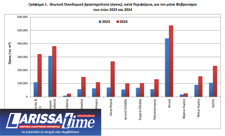 Το δίμηνο Ιανουαρίου – Φεβρουαρίου 2024, η Συνολική Οικοδομική Δραστηριότητα εμφανίζει, στο σύνολο της Χώρας, αύξηση κατά 43,7% στον αριθμό των οικοδομικών αδειών, αύξηση κατά 41,3% στην επιφάνεια και αύξηση κατά 37,2% στον όγκο, σε σχέση με το αντίστοιχο δίμηνο του έτους 2023. Κατά την ίδια περίοδο Ιανουαρίου – Φεβρουαρίου 2024,η Ιδιωτική Οικοδομική Δραστηριότητα, εμφανίζει στο σύνολο της Χώρας, αύξηση κατά 44,4% στον αριθμό των οικοδομικών αδειών, αύξηση κατά 42,7% στην επιφάνεια και αύξηση κατά 38,6% στον όγκο, σε σχέση με την περίοδο Ιανουαρίου -Φεβρουαρίου 2023.