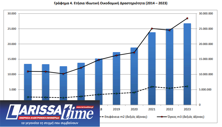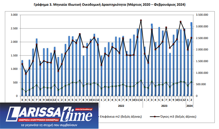 Κατά την περίοδο των τελευταίων δώδεκα μηνών, δηλαδή από τον Μάρτιο 2023 έως τον Φεβρουάριο 2024, το μέγεθος της Συνολικής Οικοδομικής Δραστηριότητας (Ιδιωτικής-Δημόσιας) με βάση τις εκδοθείσες οικοδομικές άδειες, στο σύνολο της Χώρας, ανήλθε σε 28.442 οικοδομικές άδειες, που αντιστοιχούν σε 6.555.179 m2 επιφάνειας και 30.424.052 m3όγκου. Σε σχέση με την αντίστοιχη περίοδο Μαρτίου 2022 – Φεβρουαρίου 2023 παρατηρήθηκε αύξηση κατά 12,8% στον αριθμό των οικοδομικών αδειών, αύξηση κατά 17,7% στην επιφάνεια και αύξηση κατά 20,5% στον όγκο.