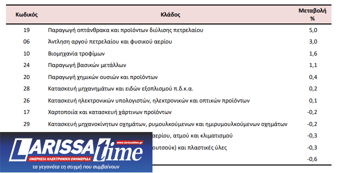 Στην αύξηση του Γενικού Δείκτη Τιμών Εισαγωγών (σύνολο αγοράς) κατά 1,2%, συνέβαλαν κυρίως οι μεταβολές των δεικτών των διψήφιων κλάδων της ταξινόμησης NACE Αναθ. 2, ως εξής: