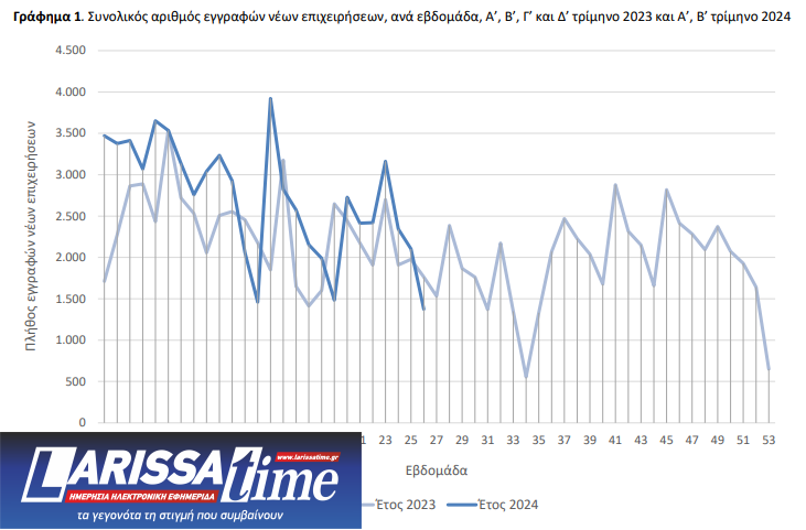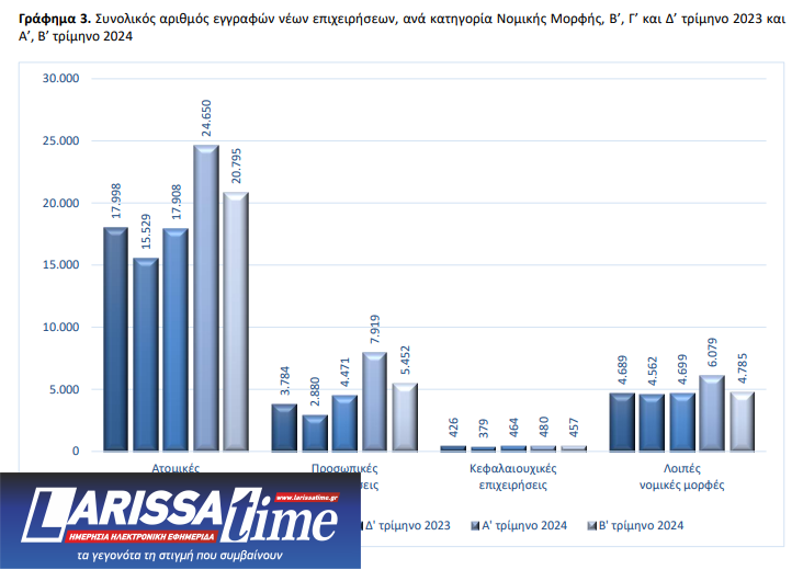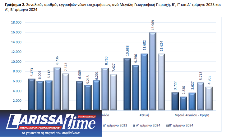 Ειδικότερα, οι εγγραφές νέων επιχειρήσεων, για το σύνολο των τομέων της οικονομίας, το Β’ τρίμηνο 2024 ανήλθαν σε 31.489, παρουσιάζοντας αύξηση 17,1% σε σχέση με το Β’ τρίμηνο 2023 που είχαν ανέλθει σε 26.897 και μείωση 19,5% σε σχέση με το Α’ τρίμηνο 2024 που είχαν ανέλθει σε 39.128.