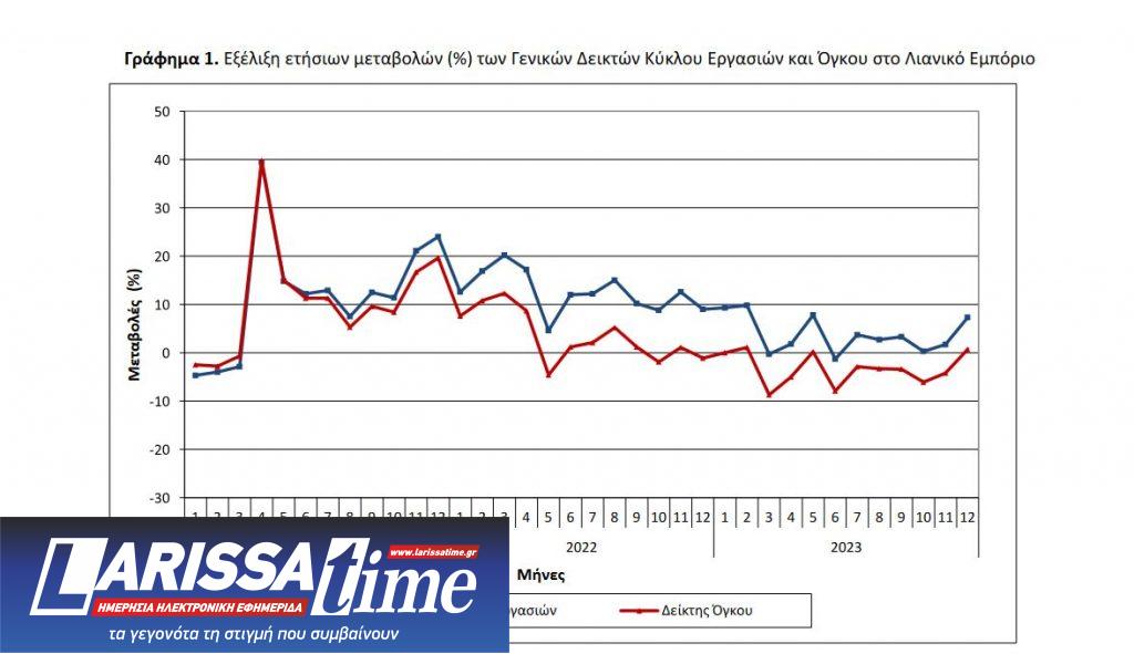 Ο Γενικός Δείκτης Όγκου (κύκλος εργασιών σε σταθερές τιμές), κατά τον μήνα Δεκέμβριο 2023, σε σύγκριση με τον αντίστοιχο δείκτη του Δεκεμβρίου 2022, παρουσίασε αύξηση 0,7% και σε σύγκριση με τον αντίστοιχο δείκτη του Νοεμβρίου 2023 αύξηση 12,7%.