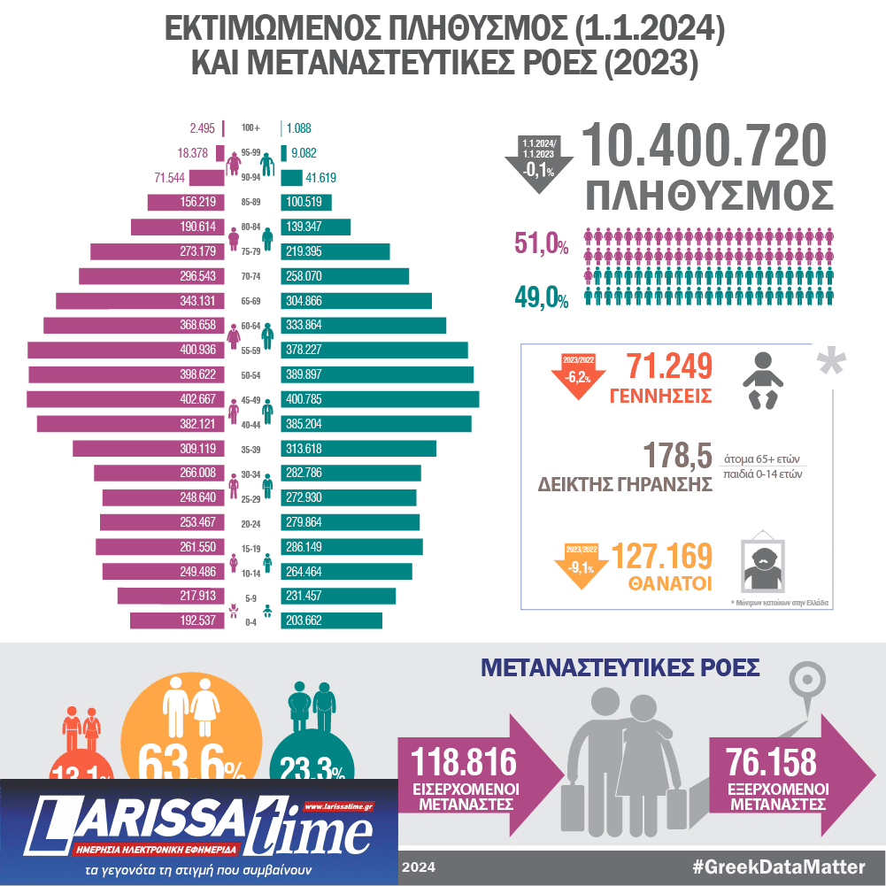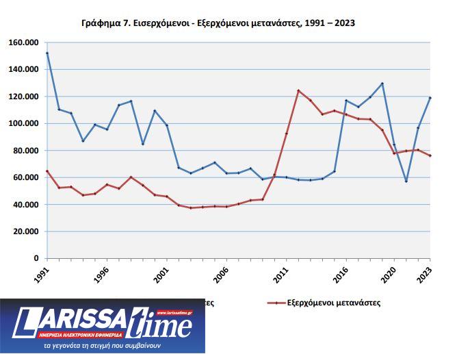 Με άλλα λόγια, αυτό που συγκρατεί την τάση μείωσης του πληθυσμού είναι η αύξηση της εισερχόμενης μετανάστευσης – η οποία σχεδόν διπλασιάστηκε το 2023 σε σχέση με το 2021.