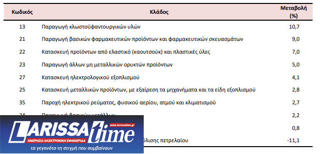 Ειδικότερα, στην αύξηση αυτή συνέβαλαν κυρίως οι μεταβολές των δεικτών των διψήφιων κλάδων της ταξινόμησης NACE