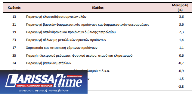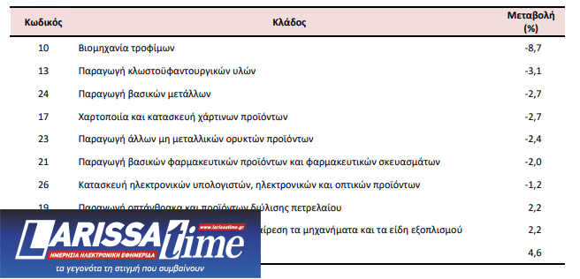 Ειδικότερα, στη μείωση αυτή συνέβαλαν κυρίως οι μεταβολές των δεικτών των διψήφιων κλάδων της ταξινόμησης NACE