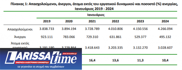 Οι απασχολούμενοι ανήλθαν σε 4.266.094 άτομα σημειώνοντας αύξηση κατά 115.538 άτομα σε σχέση με τον Ιανουάριο του 2023 (2,8%) και κατά 28.810 άτομα σε σχέση με τον Δεκέμβριο του 2023 (0,7%).