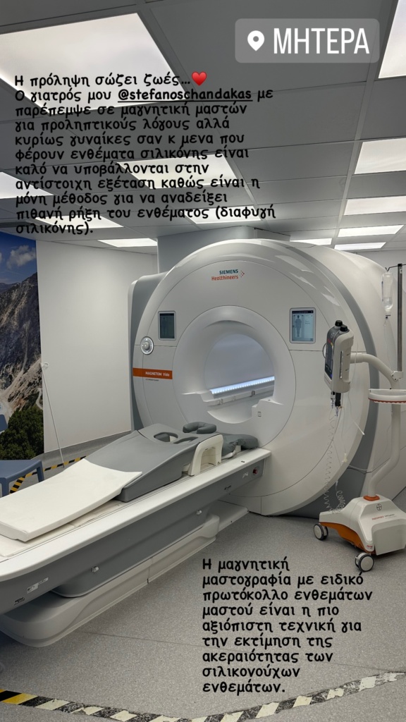 «Η πρόληψη σώζει ζωές… Ο γιατρός μου @stefanoschandakas με παρέπεμψε σε μαγνητική μαστών για προληπτικούς λόγους αλλά κυρίως γυναίκες σαν και μένα που φέρουν ενθέματα σιλικόνης είναι καλό να υποβάλλονται στην αντίστοιχη εξέταση καθώς είναι η μόνη μέθοδος για να αναδείξει πιθανή ρήξη του ενθέματος (διαφυγή σιλικόνης)».