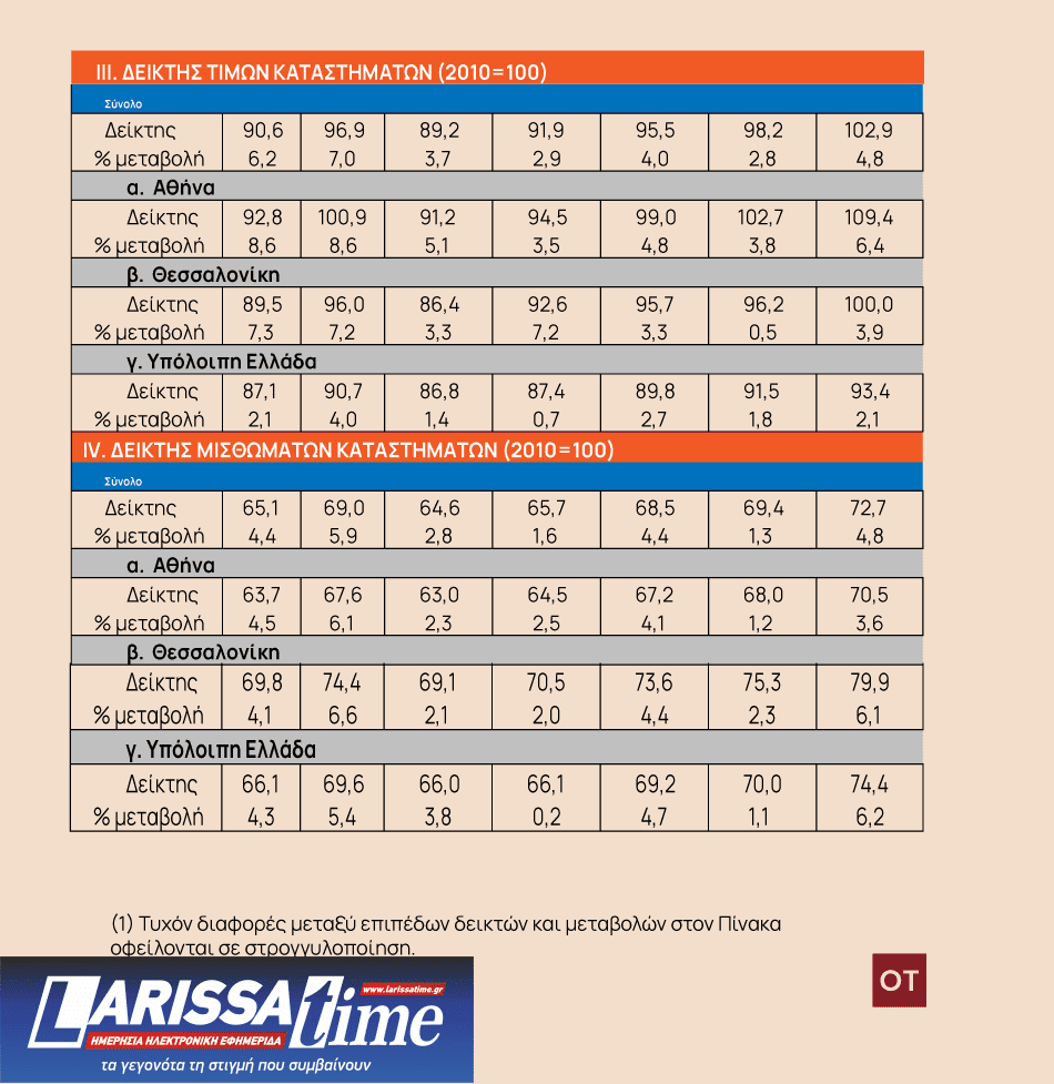 Με βάση τα αναθεωρημένα στοιχεία, το 2023 ο μέσος ετήσιος ρυθμός αύξησης των ονομαστικών τιμών καταστημάτων υψηλών προδιαγραφών διαμορφώθηκε στο 7,0% για το σύνολο της χώρας, ενώ οι αντίστοιχοι ρυθμοί αύξησης των τιμών ήταν 8,6% για την Αθήνα, 7,2% για τη Θεσσαλονίκη και 4,0% για την υπόλοιπη Ελλάδα.