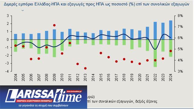 Ειδικότερα, οι εξαγωγές της χώρας μας προς τις ΗΠΑ ανήλθαν σε 2,4 δισ. ευρώ το 2024, με το 23% αυτών να αφορούν εξαγωγές ορυκτών καυσίμων, ενώ ακολούθησαν τα τρόφιμα -κυρίως φρούτα και λαχανικά- και τα βιομηχανικά προϊόντα.