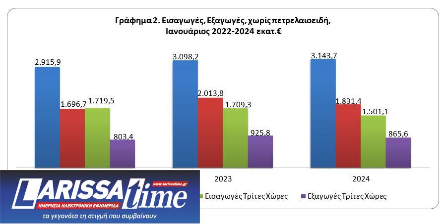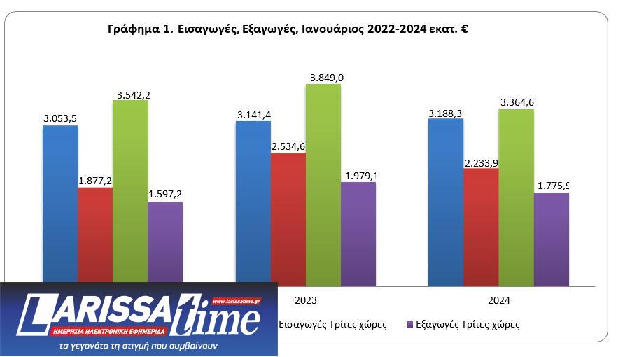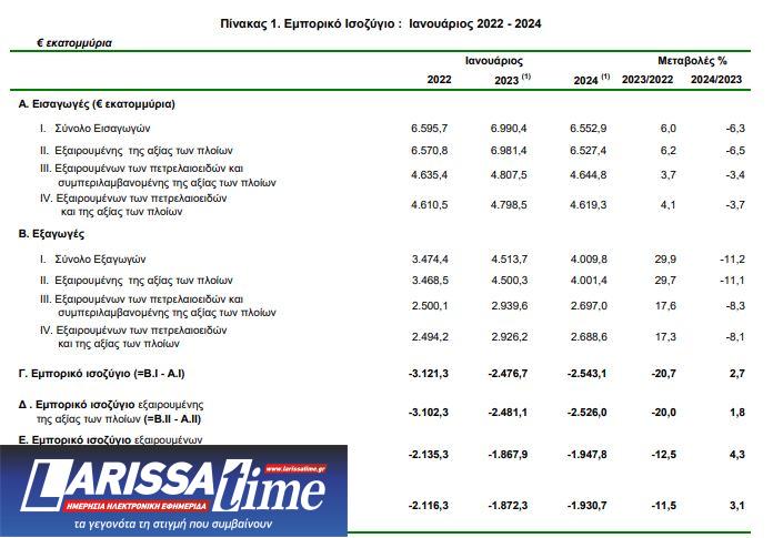 Συγκεκριμένα το έλλειμμα του εμπορικού ισοζυγίου κατά τον μήνα Ιανουάριο 2024 ανήλθε σε 2.543,1 εκατ. ευρώ (2.738,7 εκατ. δολάρια) έναντι 2.476,7 εκατ. ευρώ (2.629,9 εκατ. δολάρια) κατά τον ίδιο μήνα του έτους 2023, παρουσιάζοντας αύξηση, σε ευρώ, 2,7%. Η αντίστοιχη αξία χωρίς τα πετρελαιοειδή κατά τον μήνα Ιανουάριο 2024 παρουσίασε αύξηση του ελλείμματος κατά 79,9 εκατ. ευρώ, δηλαδή 4,3%, ενώ η αντίστοιχη αξία χωρίς τα πετρελαιοειδή και τα πλοία κατά τον μήνα Ιανουάριο 2024 παρουσίασε αύξηση κατά 58,4 εκατ. ευρώ, δηλαδή 3,1% σε σχέση με τον μήνα Ιανουάριο 2023 .