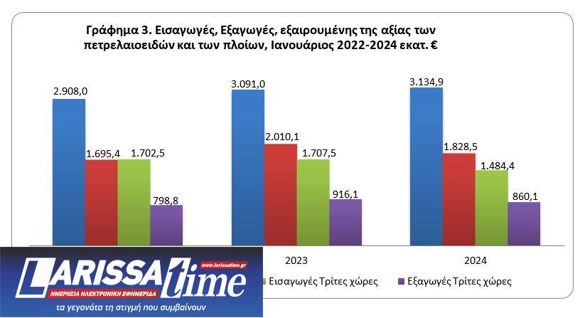 Η αντίστοιχη αξία χωρίς τα πετρελαιοειδή κατά τον μήνα Ιανουάριο 2024 παρουσίασε μείωση κατά 242,6 εκατ. ευρώ δηλαδή 8,3% και η αντίστοιχη αξία χωρίς τα πετρελαιοειδή και τα πλοία κατά τον μήνα Ιανουάριο 2024 παρουσίασε μείωση κατά 237,6 εκατ. ευρώ, δηλαδή 8,1%, σε σχέση με τον μήνα Ιανουάριο 2023.