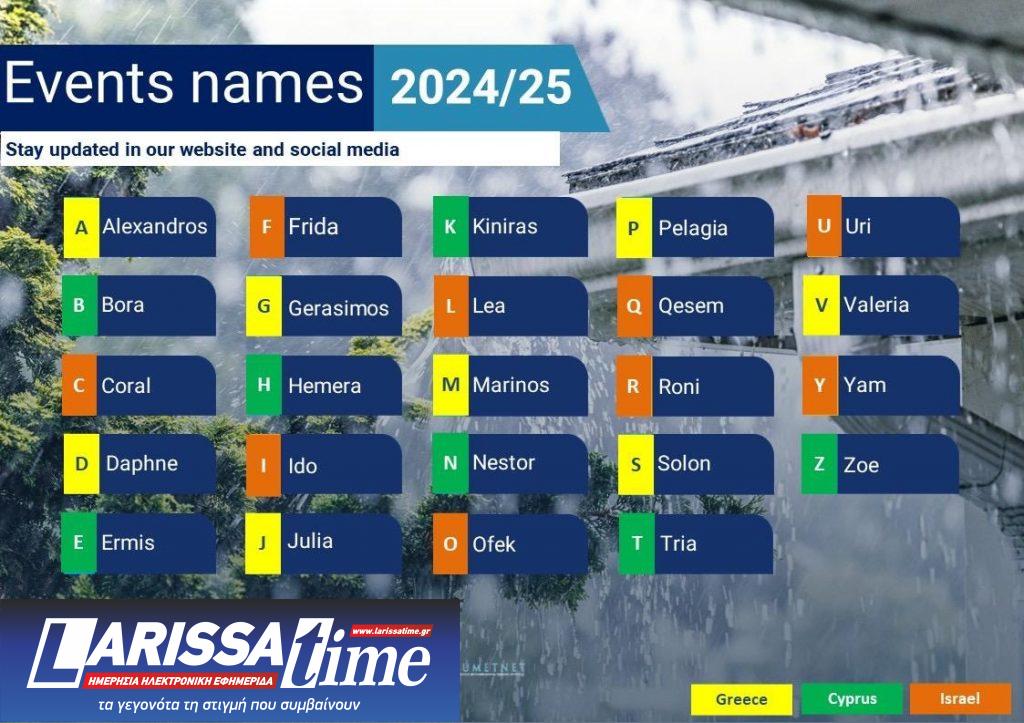 Για τη περίοδο Οκτωβρίου 2024-Σεπτεμβρίου 2025, η αλφαβητική λίστα για την Ανατολική Μεσόγειο είναι: Alexandros, Bora, Coral, Daphne, Ermis, Frida, Gerasimos, Hemera, Ido, Julia, Kiniras, Lea, Marinos, Nestor, Ofek, Pelagia, Qesem, Roni, Solon, Tria, Uri, Valeria, Yam, Zoe.