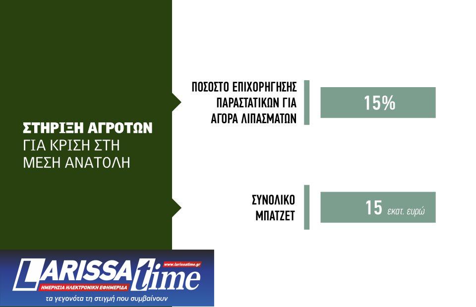 Ως γνωστόν, πρωθυπουργός Κυριάκος Μητσοτάκης, σε πρώτο χρόνο και στη συνέχεια ο Υπουργός Εθνικής Οικονομίας και Οικονομικών εξήγγειλαν ακόμα πως σε ότι αφορά τον πρωτογενή τομέα, η στήριξη της κυβέρνησης, προς ώρας τουλάχιστον, περιορίζεται στην επιχορήγηση από τον κρατικό προϋπολογισμό του 15% του κόστους των παραστατικών για την αγορά λιπασμάτων. Η σχετική κάλυψη αθ αφορά την περίοδο την 1η Απριλίου έως και την 31 Μαΐου με συνολικό δημοσιονομικό κόστος περί τα 15 εκατ. ευρώ.