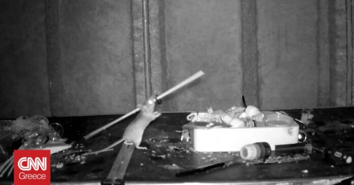 Τα πλάνα έδειξαν το ποντίκι να μαζεύει μανταλάκια ρούχων, φελλούς, παξιμάδια και βίδες και να τα τοποθετεί σε ένα κουτί στον πάγκο εργασίας του Χόλμπρουκ.