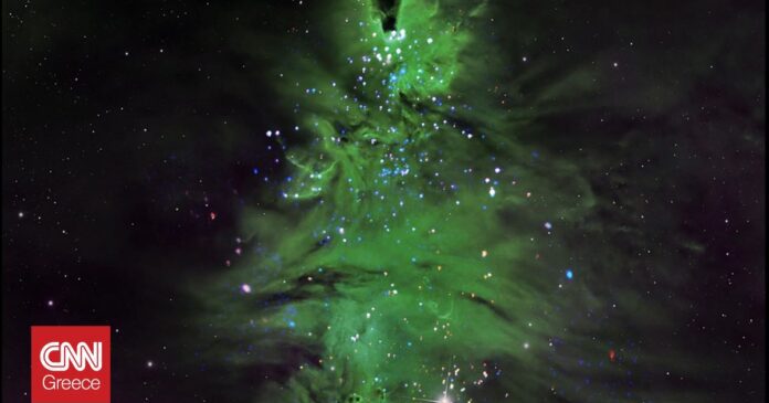 Αυτά τα αστέρια απαθανατίζονται ως μπλε και άσπρα φώτα και περιβάλλονται από στροβίλους αερίου – τις «πευκοβελόνες» του δέντρου – με το πράσινο να αντιπροσωπεύει το φως στο ορατό φάσμα.
