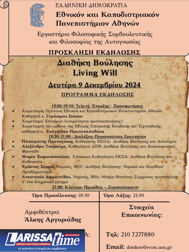 Το Εργαστήριο Φιλοσοφικής Συμβουλευτικής και Αυτογνωσίας του ΕΚΠΑ, στο πλαίσιο του ανοίγματος της ακαδημαϊκής κοινότητας προς την Ελληνική Κοινωνία, αποφάσισε την πραγματοποίηση τυχαιοποιημένης μελέτης σ’ ένα ευρύ δείγμα συμπολιτών μας, με θέμα την στάση των Ελλήνων απέναντι σ’ ένα θεσμό τη Διαθήκη Βούλησης (Living Will), ο οποίος έχει καθιερωθεί σε πολλές χώρες του Εξωτερικού.