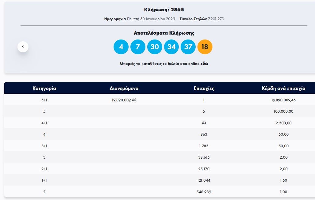 Οι τυχεροί αριθμοί που κληρώθηκαν είναι οι εξής: 4, 7, 30, 34, 37 και ΤΖΟΚΕΡ ο αριθμός: 18.