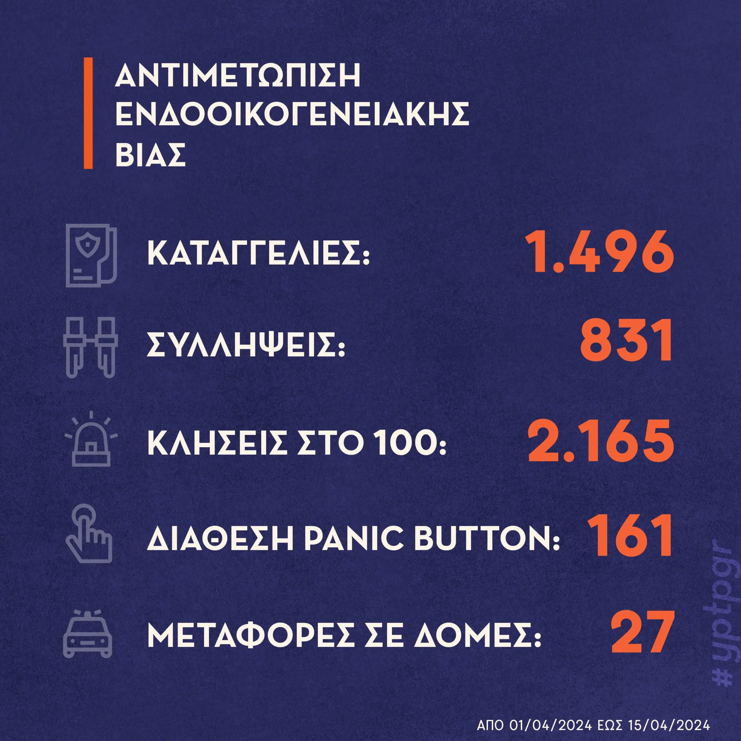 Ειδικότερα από 1 έως 15 Απριλίου οι αστυνομικοί σε όλη τη χώρα ανταποκρίθηκαν σε 2.165 κλήσεις στο τηλεφωνικό κέντρο της Άμεσης Δράσης και χορηγήθηκε σε 161 γυναίκες θύματα η εφαρμογή του Panic Button.